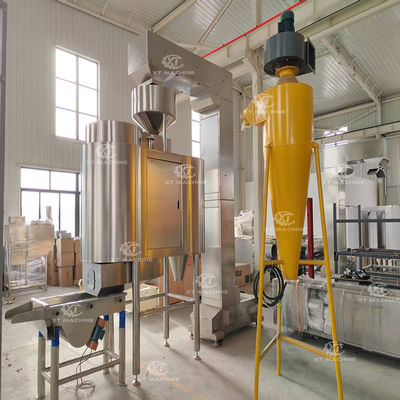 The materials are weighed in the weighing hopper through the feeder, and then put into the peeling drum, which is equipped with spiral pieces. The compressed air blow into the peeling drum to makes the materials roll and rub in the spiral pieces to achieve the peeling result. The powder and red coat produced in the process of peeling under the action of compressed air will enter the primary dust collection room through the air flow, and the dust will be precipitated by the internal rotation of the wind, while the red coat will be collected by cycloneAfter the material is peeled, it will be discharged into the vibrating screen to remove impurities and get the well peeled peanut.